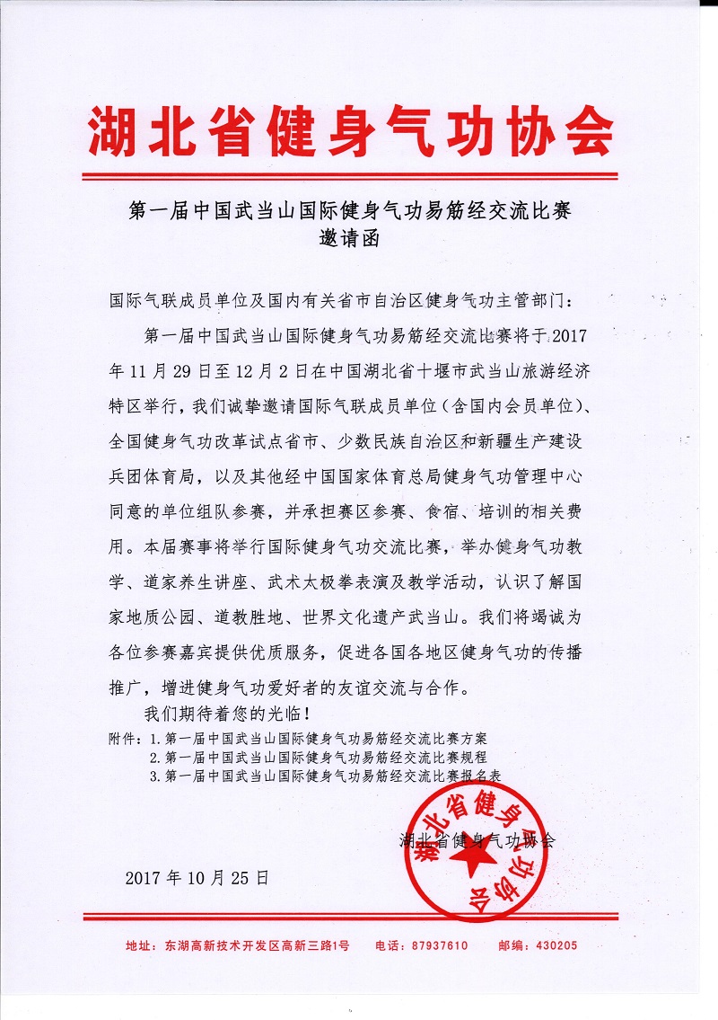 第一届中国武当山国际健身气功易筋经交流比赛调整到2017年11月29日至12月2日举行。主办单位欢迎国际气联会员单位组队参赛,并承担参赛、食宿、培训的相关费用。具体参见邀请函及相关附件。